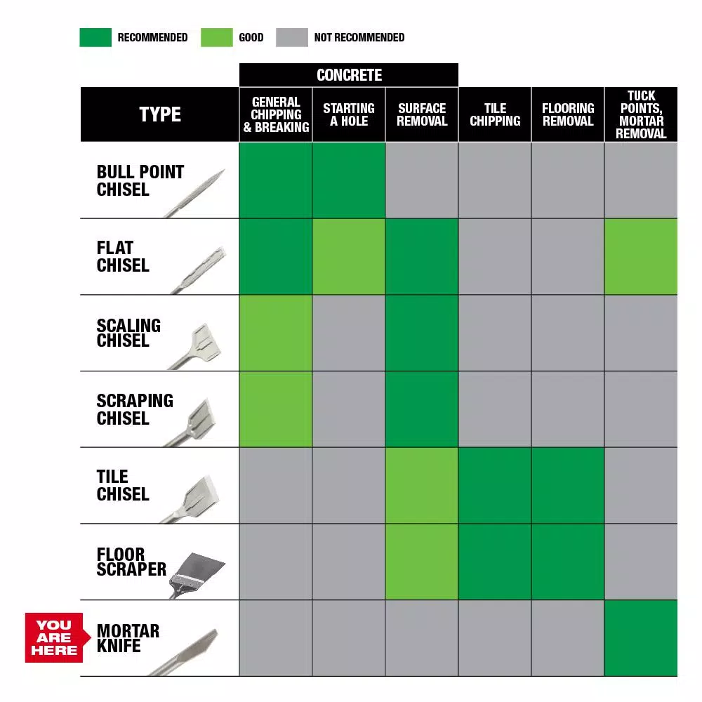 The Milwaukee SDS-PLUS SLEDGE 1/4 in. Mortar Knife stays sharper longer. Reinforced edges deliver maximum durability and reduced wear over the life of the chisel. This mortar knife is optimized with a 1/4 in. profile for horizontal and vertical mortar joints, ideal for removing mortar between bricks. The precision-forged tip helps preserve decorative stone and brickwork and a dust channel provides fast debris removal. Milwaukee engineered this mortar knife to maintain its shape for increased productivity with high grade forged steel for maximum durability. For use with SDS-PLUS rotary hammers.