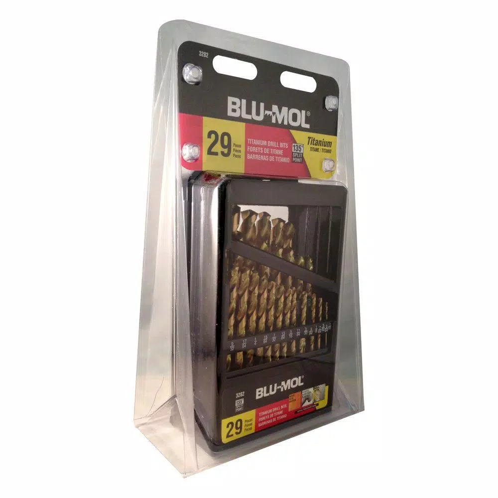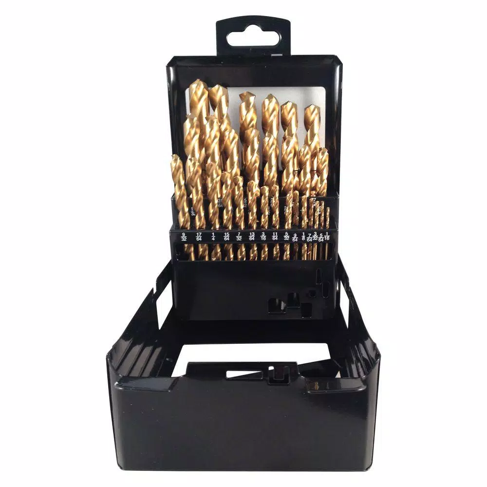 Titanium M2 steel drill bits provide best performance needed in industrial and multi-purpose applications. Best for soft metal, brass, bronze, low alloy steel, sheet metal and moderate jobs in hard metal and heat-treated steel. Set contains (1) of the following drill sizes: 1/16 in., 5/64 in., 3/32 in., 7/64 in., 1/8 in., 9/64 in., 5/32 in., 11/64 in., 3/16 in., 13/64 in., 7/32 in., 15/64 in., 1/4 in., 17/64 in., 9/32 in., 19/64 in., 5/16 in., 21/64 in., 11/32 in., 23/64 in., 3/8 in., 25/64 in., 13/32 in., 27/64 in., 7/16 in., 29/64 in.,15/32 in., 31/64 in., and 1/2 in. metal index case. Drill bits 25/64 in. and above feature 3/8 in. reduced shank.