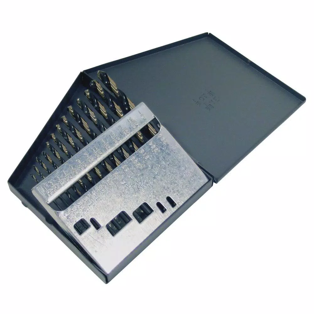 This 1/16 in. to 1/4 in. High Speed Steel Heavy-Duty Jobber Length Drill Set features drills with right-hand direction of cut and was designed for drilling metal, wood and plastic. The drills were precision ground to tight tolerances with geometries that include 135-degree split point to eliminate walking of the drills on the work-pieces and 3 flats on the shanks of drills above 11 in./64 in. for tighter chucking. This premium high speed steel drill set also has nitride black and gold treatment for increased hardness and tool longevity.