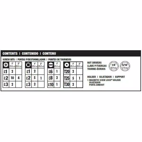 - Includes: (36) 1 in. bits, (6) 2 in. bits, (2) nut drivers and (1) bit tip holder