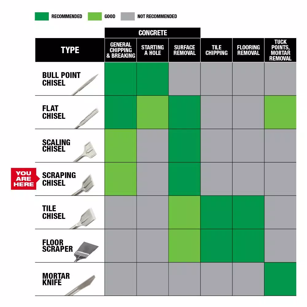The Milwaukee SDS-MAX SLEDGE Scraping Chisel stays sharper longer. Reinforced edges deliver maximum durability and reduced wear over the life of the chisel. Engineered to maintain sharper edges for increased productivity. The optimized tip offers fast removal of concrete, mortar, rust, cutting troughs and asphalt. No re-sharpening or re-hardening is necessary for reduced downtime. For use with SDS MAX rotary hammers. The SDS-MAX SLEDGE Scraping Chisel offers longer life in concrete demolition over standard Milwaukee chisels with high grade forged steel for maximum durability.