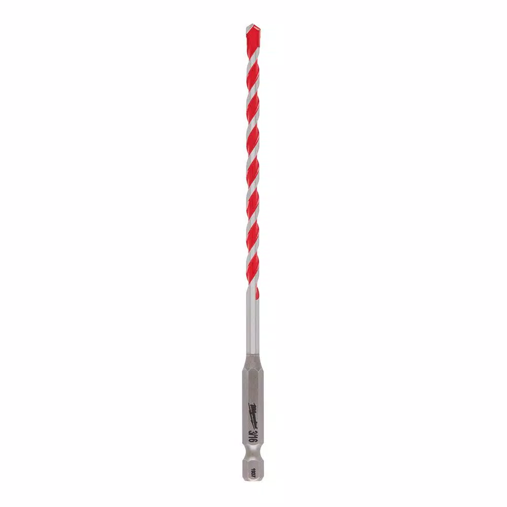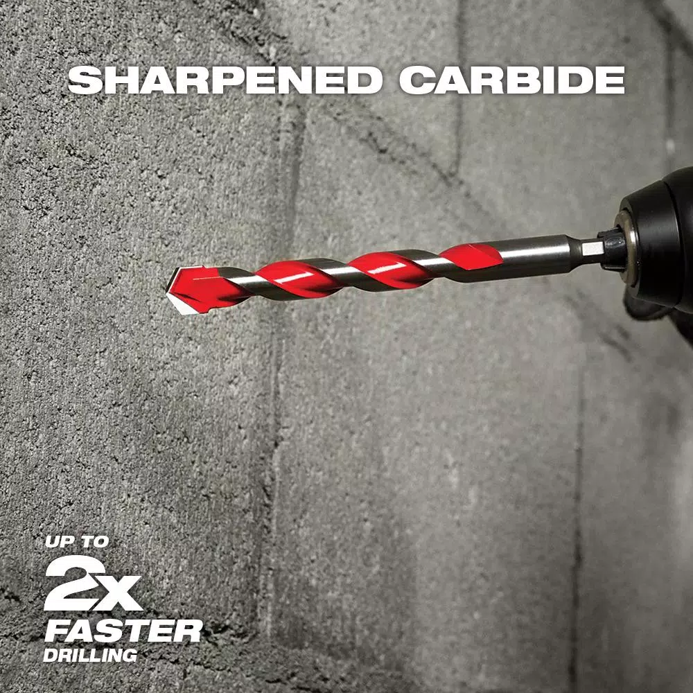 The Milwaukee 3/16 in. x 4 in. x 6 in. SHOCKWAVE Carbide Hammer Drill Bit uses sharpened carbide to deliver up to 5X longer life in concrete and up to 2X faster drilling into masonry materials. Engineered with a precision ground tip, these bits deliver faster starts and less walking in concrete, brick and block. The carbide-tipped masonry drill bitsβ wide flute design removes dust faster, reducing heat and delivering more holes per charge. Equipped with a 1/4 in. Hex Shank, Milwaukee SHOCKWAVE Carbide Hammer Drill Bits are the ideal solution for drilling in masonry materials with both impacts and hammer drills/drivers.
