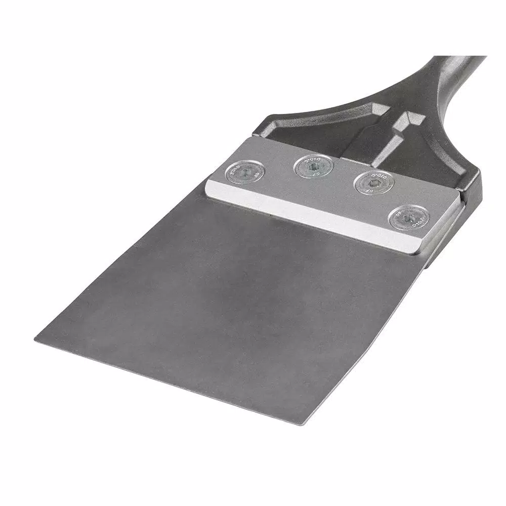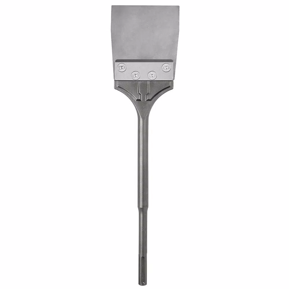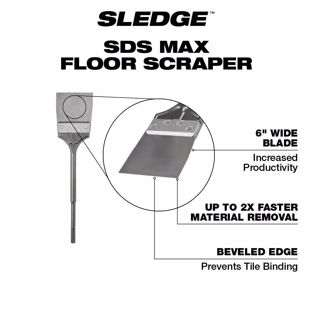 The Milwaukee SDS-MAX SLEDGE Floor Scraper stays sharper longer. Optimized design delivers up to 2x faster material removal. The SLEDGE Floor Scraper is ideal for tile, linoleum, laminate and adhesive removal. This floor scraping chisel has a 6 in. wide blade for increased productivity. The sharpened, flexible blade cuts under material faster with a beveled plate edge to prevent material binding. The countersunk bolts reduce loosening and high grade forged steel provides maximum durability. For use with SDS-Max rotary hammers.