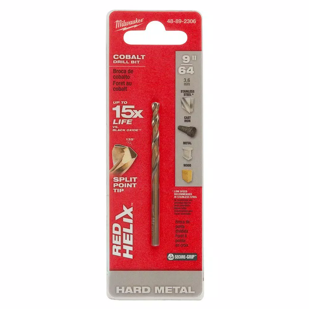 The MILWAUKEE RED HELIX Cobalt 9/64 in. Drill Bit are engineered for extreme durability and longer life in hard metal applications. The Milwaukee Cobalt drill bits are designed with a VARIABLE HELIX that includes an aggressive 35Β° Helix Angle which ends at 15Β°. The 135Β° split point tip delivers a precision start and prevents walking for fast, accurate holes in Hard Metal, PVC and wood.The tapered drill bits feature a new ENHANCED TAPERED WEB that strengthens the bitβs core to increase flute durability. The cobalt twist drill bits are ideal for tough applications, providing up to 15X life vs. Black Oxide Drill Bits.