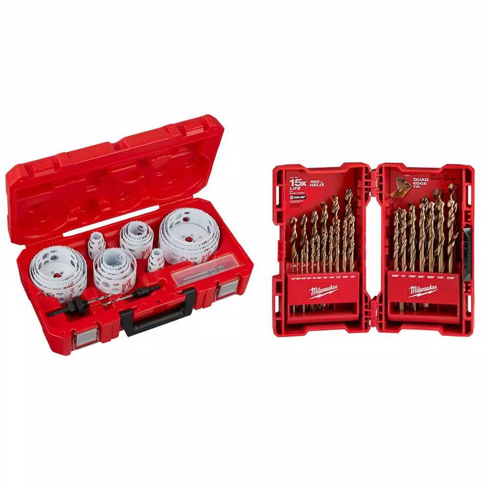 Hole Dozer General Purpose Bi-Metal Hole Saw Set with Cobalt Drill Bit Set (57-Piece). Milwaukee Bi-Metal General-Purpose HOLE DOZER Hole Saws are engineered for longer life and faster cutting performance and is the Most Durable Hole Saw, backed by a limited lifetime tooth break warranty. The hole saws feature RIP GUARD teeth built with more steel behind the cutting edge for added strength, giving increased productivity on the job site and better hole quality. Each HOLE DOZER is coated with a low friction, thermoset paint that provides faster cutting speed in wood and more holes cut per battery charge. The Plug Jack enables access into the cup for both thick and thin material removal, eliminating wasted downtime between holes. Milwaukee RED HELIX Cobalt Drill Bits are engineered for extreme durability and longer life in hard metal applications. The Milwaukee Cobalt drill bits are designed with a VARIABLE HELIX that includes an aggressive 35ยฐ Helix Angle which ends at 15ยฐ. The 135ยฐ split point tip delivers a precision start and prevents walking for fast, accurate holes in Hard Metal, PVC and wood.The tapered drill bits feature a new ENHANCED TAPERED WEB that strengthens the bitโs core to increase flute durability. The cobalt twist drill bits are ideal for tough applications, providing up to 15X life vs. Black Oxide Drill Bits.
