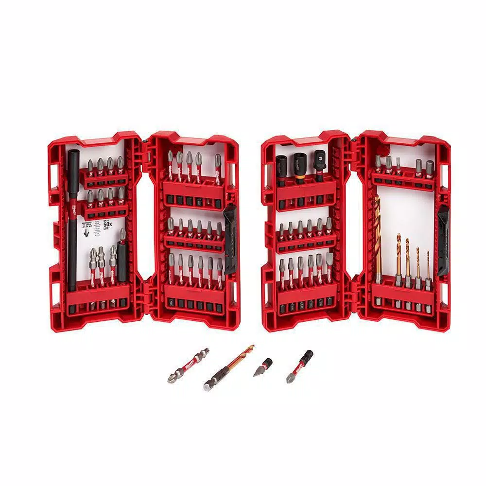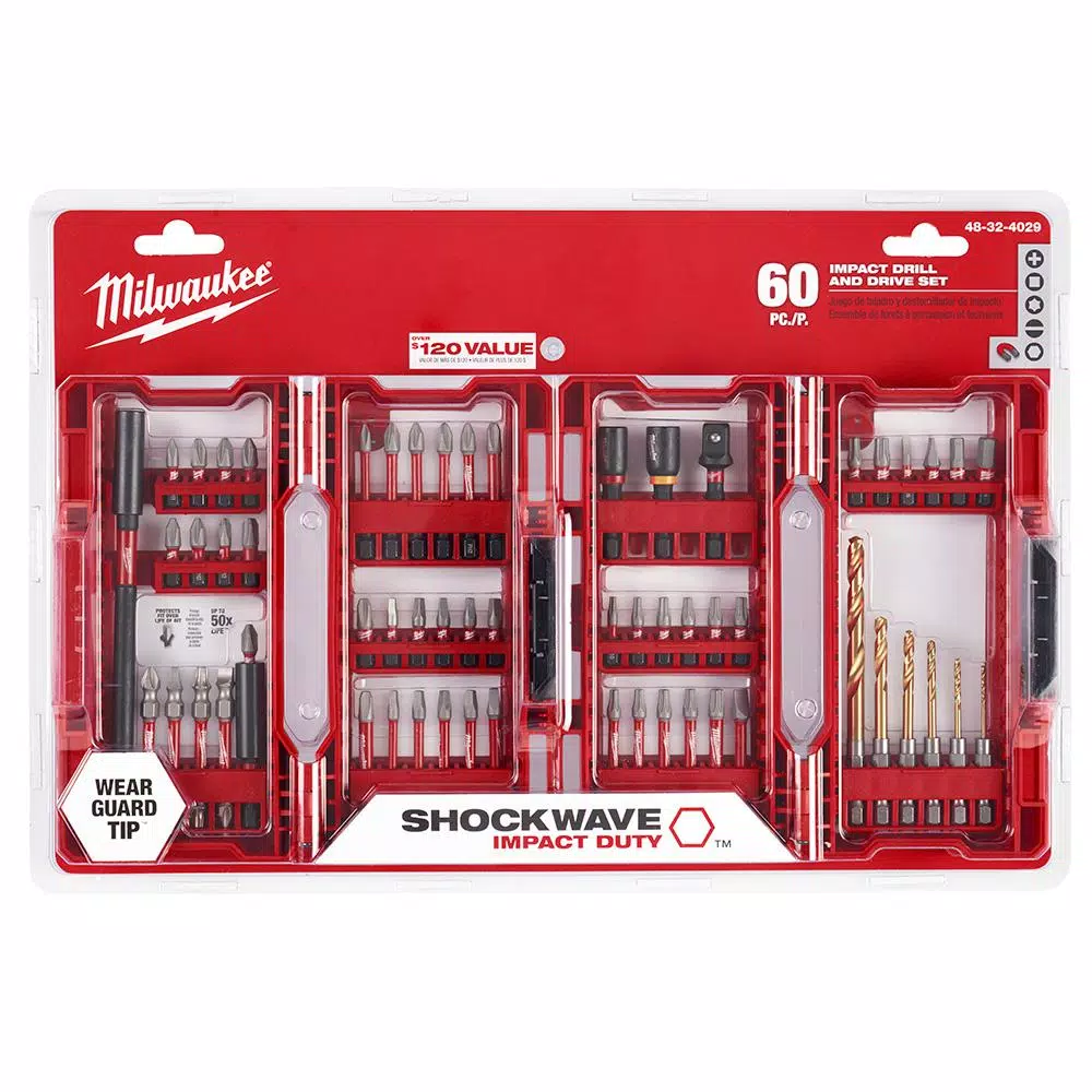The Milwaukee Shockwave 60pc Impact Driver Bit Set is engineered to be the Most Durable, Best Fitting driver bits on the market. The Wear Guard Tip delivers increased wear resistance which protects the impact bitβs fit over the life of the bit. The Shockzone is optimized for each tip type and length of driver bit in the set to absorb peak torque and prevent breaking. The driver bits have Custom Alloy76 for a customized steel and heat treatment per tip type to extend the life of the userβs driver bits, providing up to 50X life versus other impact driver bits on the market. The Milwaukee Shockwave driver bits are built to provide users with extreme durability for the most demanding applications.
