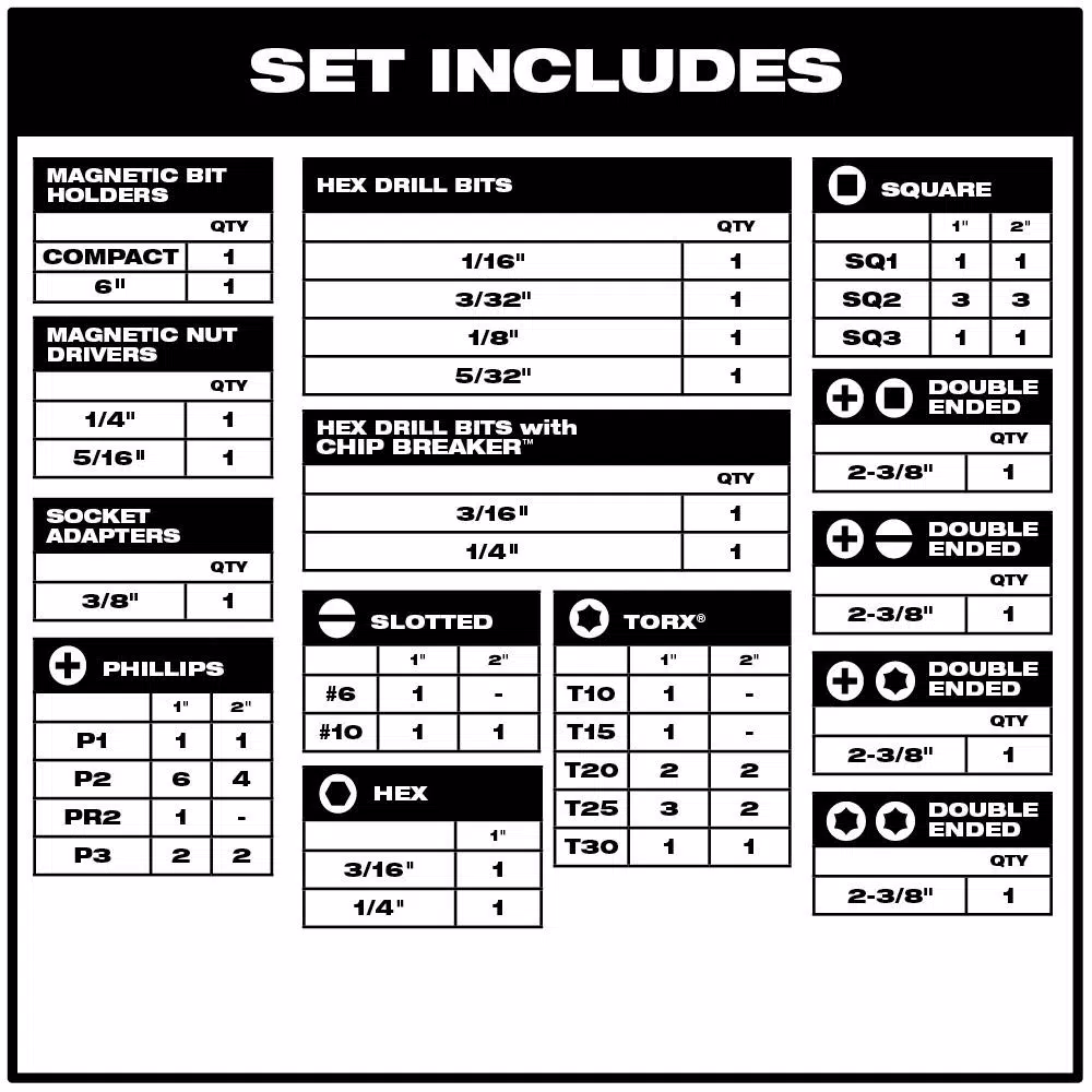 - Includes: Compact Magnetic Bit Holder; 6β³ Magnetic Bit Holder; (27) 1β³ Insert Bits: P1, (6) P2, (2) P3, PR2, SQ1, (3) SQ2, SQ3, T10, T15, (2) T20, (3) T25, T30, SL1/8β³, SL1/4β³, 3/16β³ Hex, 1/4β³ Hex; (18) 2β³ Power Bits: P1, (4) P2, (2) P3, SQ1, (3) SQ2, SQ3, (2) T20, (2) T25, T30, SL1/4β³; (4) Double Ended Bits: P2/SQ2, P2/SL1/4β³, P2/T25, T20/T25; (2) Magnetic Nut Drivers: 1/4β³, 5/16β³; (6) Hex Shank Drill Bits: 1/16β³, 3/32β³, 1/8β³, 5/32β³, 3/16β³, 1/4β³; Socket Adapter:1/4β³ Hex to 3/8β³ Square