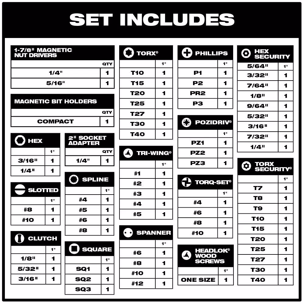 - Also includes: Hex Security, 3/16″ Hex Security, 7/32″ Hex Security, 1/4″ Hex Security, #6 Spanner, #8 Spanner, #10 Spanner, #12 Spanner, 1/8″ Clutch G, 5/32″ Clutch G, 3/16″ Clutch G, PZ1, PZ2, PZ3, #1 TRI-WING®, #2 TRI-WING®, #3 TRI-WING®, #4 TRI-WING®, #5 TRI-WING®, #4 TORQ-SET®, #6 TORQ-SET®, #8 TORQ-SET®, #10 TORQ-SET®, #4 Spline, #5 Spline, #6 Spline, #8 Spline, One Size HEADLOK®; (2) Magnetic Nut Drivers: 1/4″, 5/16″; Socket Adapter: 1/4″