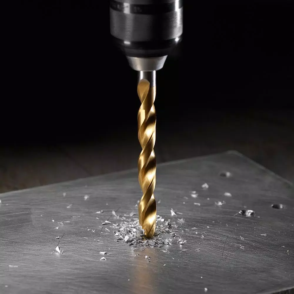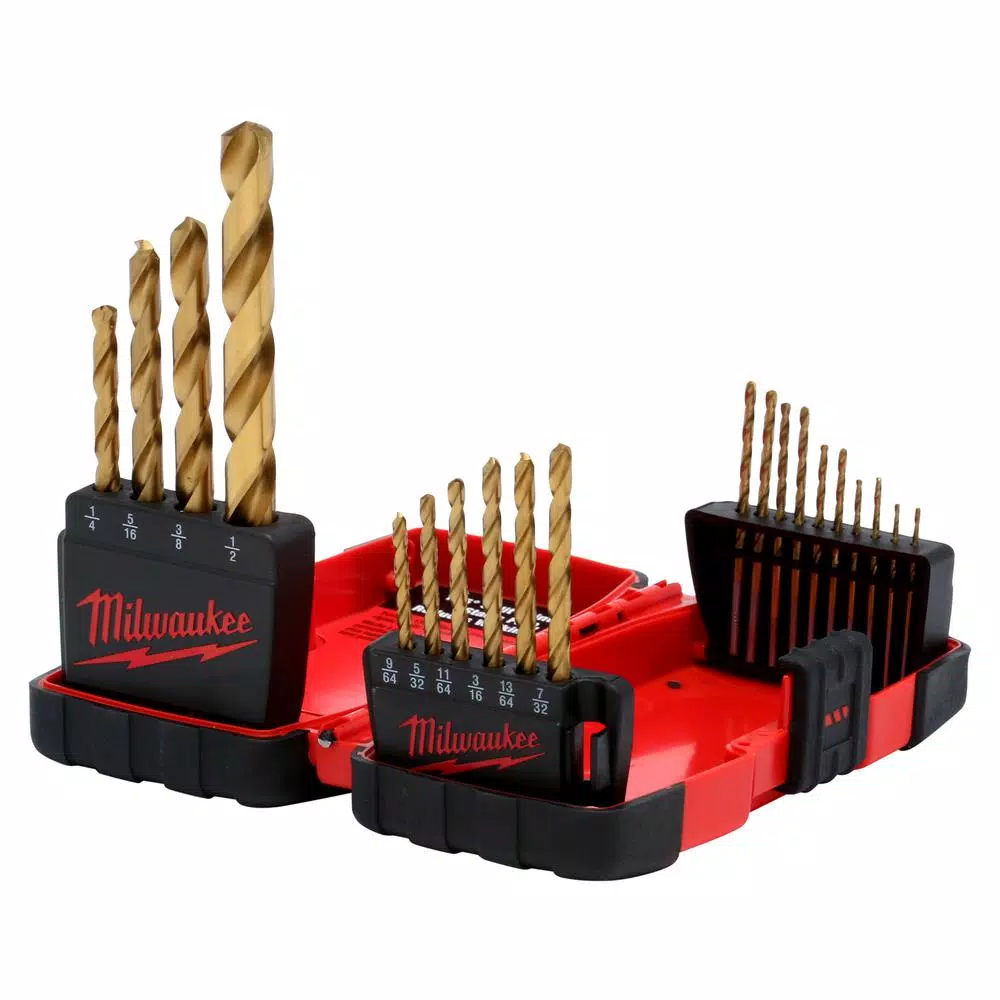 Enjoy the convenience and heavy-duty performance of the Milwaukee Titanium Coated Twist Drill Bit Set. These drill bits were designed for extreme durability and long-life. Use them to drill curved surfaces, as they require less effort to drill through wood, metal and PVC and are highly recommended for use with portable drills. The titanium coating reduces heat buildup and keeps the bit sharp. The tapered web resists side-load breakage, while the 3-Flat Secure-Grip shank holds the bit firmly in the drill chuck. The 135 split-point tip gives you a precision start and prevents walking for fast, accurate holes. The set comes in a resilient case and includes the following bits: two 1/16 in., two 5/64 in., two 3/32 in., two 7/64 in., two 1/8 in., 9/64 in., 5/32 in., 11/64 in., 3/16 in., 13/64 in., 7/32 in., 1/4 in., 5/16 in., 3/8 in. and 1/2 in.