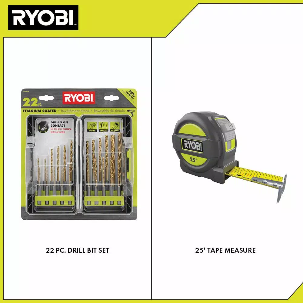 RYOBI introduces the Titanium Drill Bit Kit (22-Piece). The RYOBI 22-piece Titanium Coated Drill Bit Set makes a great addition to any tool set. Its bits range in size from 1/16 in. to 3/8 in. and all feature a 135Β° split point tip that prevents walking. All of the bits feature a 1/4 in. hex shank for easy bit changes and can be used for drilling wood, metal, and plastic material. The kit includes 22 titanium coated bits from 1/16 in. to 3/8 in. The Bonus 25 ft. Tape Measure features a measuring range of 25 ft., making it perfect for all of your larger projects. Its reinforced rubber overmold housing fits comfortably in your hand while also making it impact resistant and heavy duty. The blade features fractions markings for superior accuracy and a nylon coating for wear resistance and durability. It also features an ACCUSLIDE Hook that automatically adjusts for inside and outside measurements. The wireform belt clip reduces belt/pocket fraying and helps keep your tape measure within reach.
