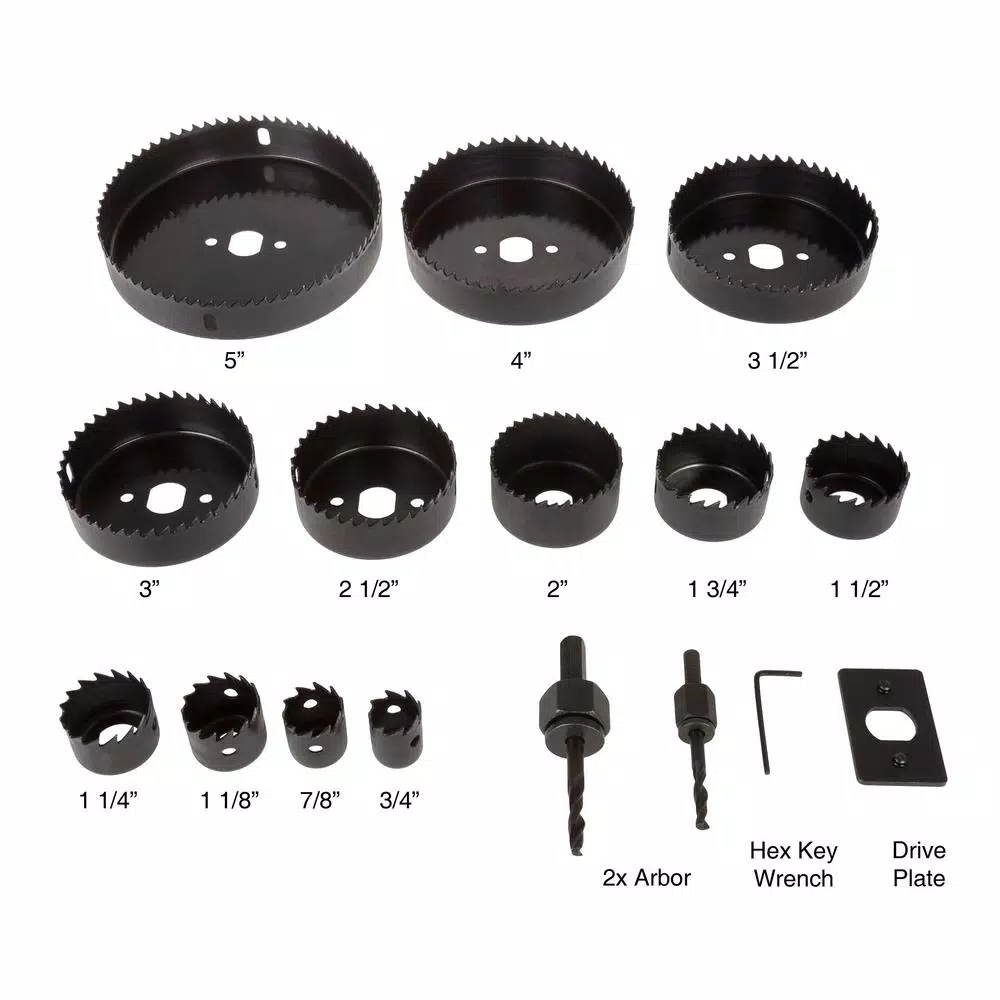 - Includes: 3/4 in., 7/8 in., 1 1/8 in., 1 1/4 in., 1 1/2 in., 1 3/4 in., 2 in., 2 1/2 in., 3 in., 3 1/2 in., 4 in., 5 in., 2 arbors, 1 hex key wrench, 1 drive plate and case
