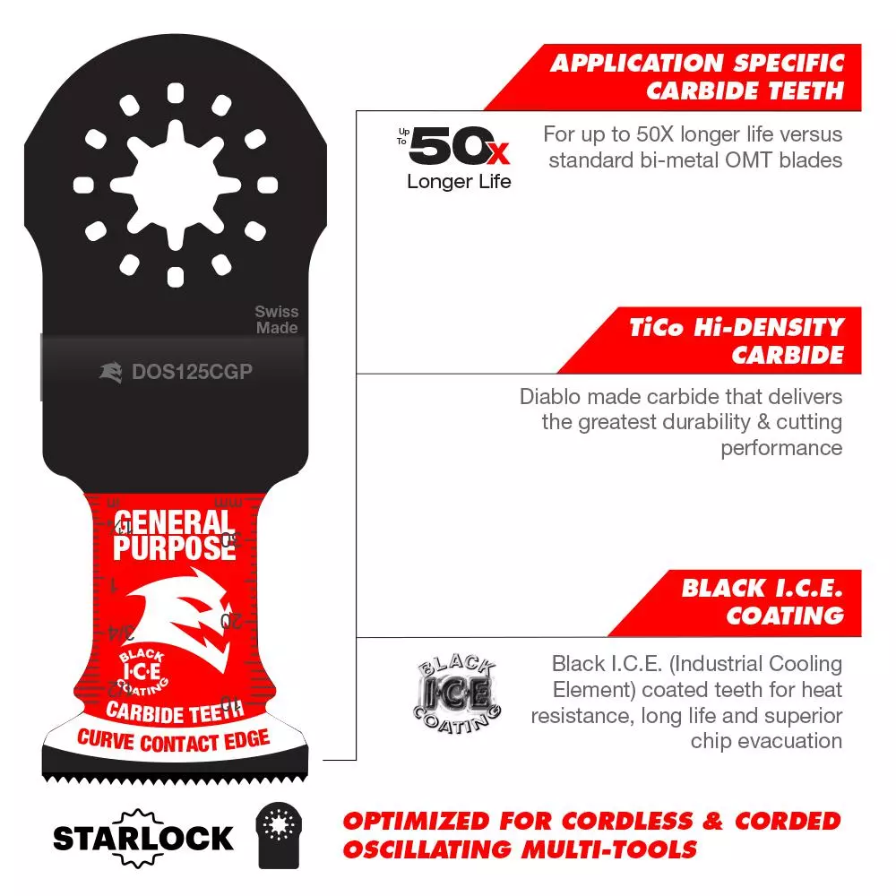 DIABLOโs universal fit carbide oscillating blades feature application specific designs that deliver extreme durability and superior cutting life in general purpose cuts: nail-embedded wood, clean wood, metal and plastics. High-performance carbide teeth deliver an unmatched up to 50X longer cutting life versus standard bi-metal blades. Curve contact edge creates a pilot for precise, clean plunge cuts with less vibration. An optimized blade design and Black I.C.E. (Industrial Cooling Element) keeps the teeth cool and build up free for fast, clean cuts. The bladeโs universal fit, adapter-free design easily attaches to most tools, with the exception of Starlock tools.