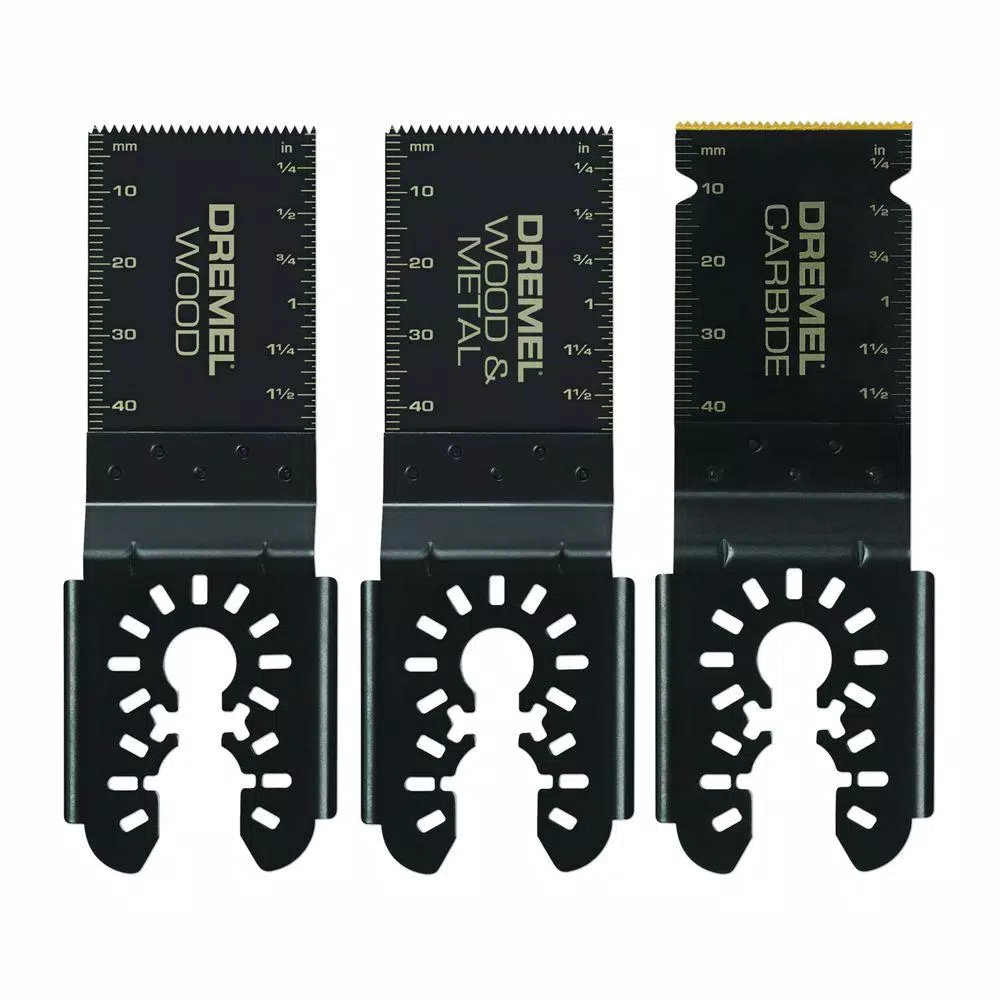 Dremel universal oscillating accessories are the first truly universal oscillating accessories available that require no adapter. The unique dual interface fits all competitive oscillating tools, including those with a quick change feature. The 3 flush cut blades can be used to make precise cuts in a variety of materials, from wood, plastic, drywall and other soft materials with the MM480U Wood Blade, to wood with nails with the MM482U Blade, to harder materials such as metal, screws, stainless steel bolts, galvanized pipe, plaster, cement board, slate and ceramic tile with the MM485U Blade.