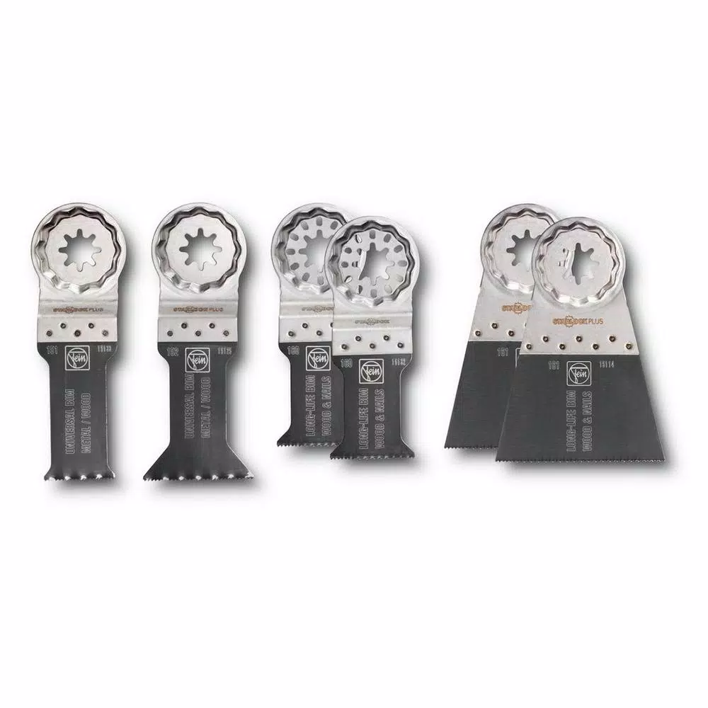 The star lock mount allowing the blades to fit competitor tools improving performance. Made in germany the fein 35222942080 assorted star lock plus oscillating saw blades kit comes included with (2) 160 long-life blades, (2) 161 long-life blades, (1) 151 universal blade and (1) 152 universal blade.