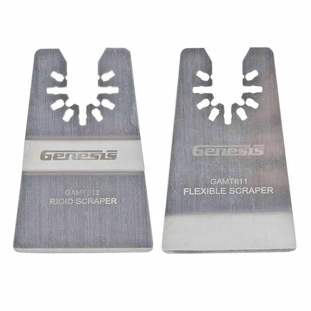 2-Piece Scraper Blade Pack includes 2 in. Flexible Scraper and 2 in. Rigid Scraper blades for your oscillating tool. Use rigid blade for removal of vinyl flooring, bonded carpeting, old coats of paint or varnish, and adhesives. Flexible blade is used to remove caulk, coats of peeling paint, and soft adhesives. GAMT601 2-Piece Scraper Blade Pack is an excellent accessory for our popular Genesis GMT15A, GMT16V and GMT25T oscillating tools.