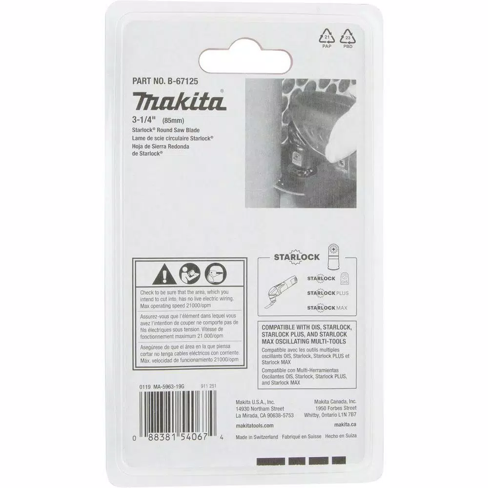 The Makita 3-1/4 in. Starlock Round Saw Blade is engineered for cutting hard and soft wood, soft metals, MDF, PVC, and drywall. It is ideal for plunge cuts into drywall or plasterboard when installing electrical outlets. They can cut crown molding, case, base, wood flooring and wood trim. The Bi-metal construction and titanium tooth coating provide increased performance and longer accessory life. The Starlock Interface is compatible with most oscillating multi-tools (sold separately).