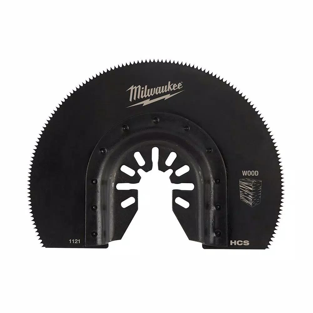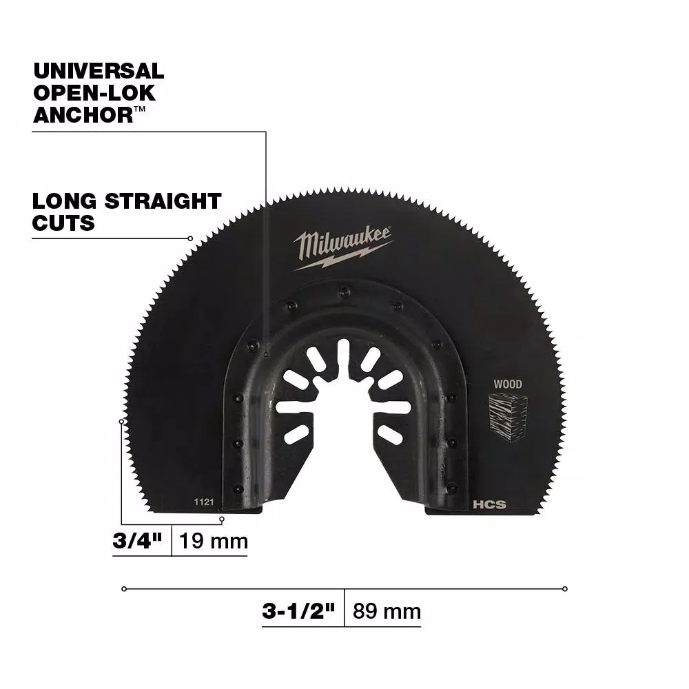 The MILWAUKEE Universal Fit OPEN-LOK Oscillating Multi-Tool 3-1/2 in. HCS Wood Blade 1 Pack is made from premium high carbon steel with edge ground teeth, providing users with optimal cutting performance in wood, PVC, drywall, and other soft materials. This Milwaukee blade delivers faster cuts than the previous generation of high carbon steel blades with more teeth and an increased 1-3/8 in. cutting width with a deeper plunge cut. This wood cutting blade for multi-tools is designed with global materials.