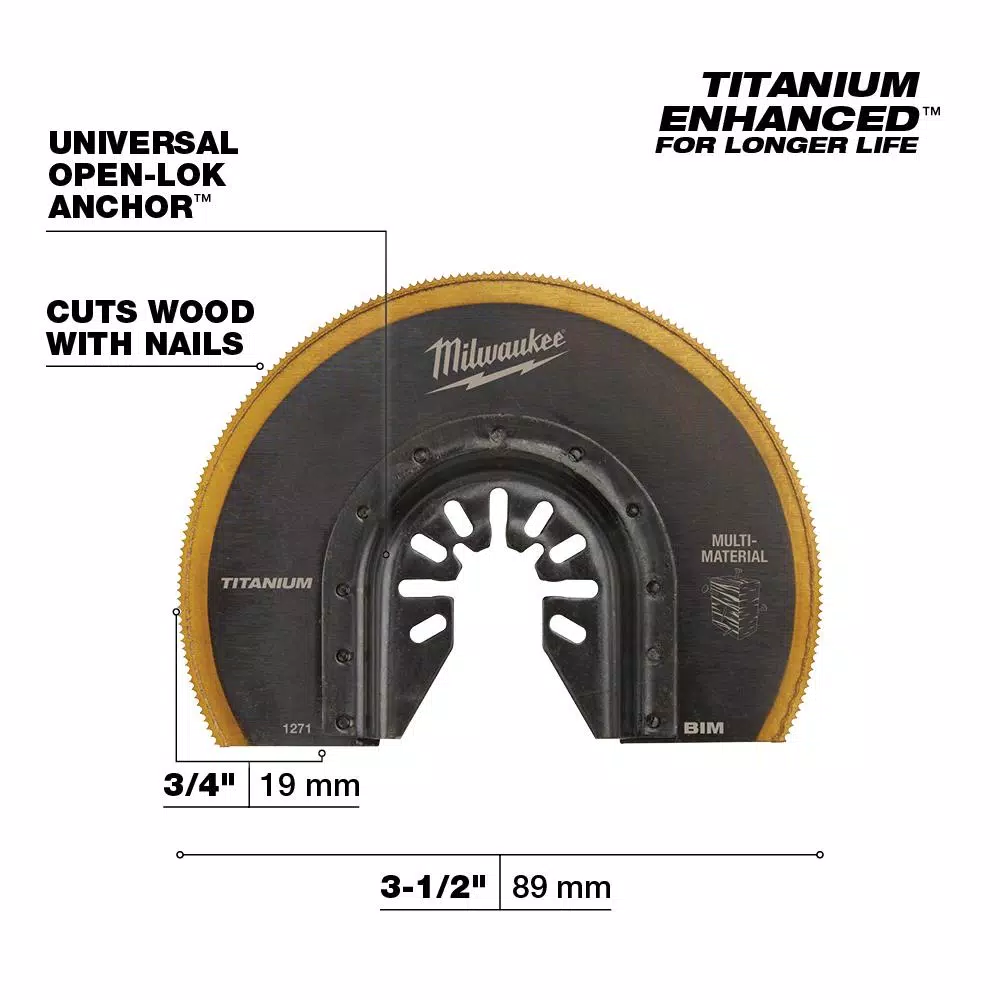 The MILWAUKEE Universal Fit OPEN-LOK 3-1/2 in. Titanium Enhanced Bi-Metal Blade 1 Pack is designed for Oscillating Multi-Tools. These multi-tool blades for metal are titanium enhanced and made from premium high-speed steel. The 3-1/2 in. bi-metal blade has a slightly narrower cutting width than most standard bi-metal blades and a slightly longer blade body, designed for cutting soft metals, wood, nails, PVC, and drywall. It uses a combination of tooth form and material to offer users better cutting performance in soft metals. These bi-metal multi-tool blades are designed with global materials.