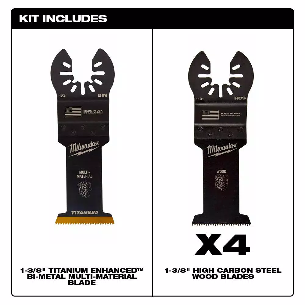 The MILWAUKEE Universal FIt OPEN-LOK 5-Piece Oscillating Multi-Tool Blade Variety Pack contains (2) Titanium Enhanced Blades made from premium high-speed steel. These 1-3/8 in. Bi-Metal Blades are ideal for users cutting wood & nails, PVC, and drywall. These multi-tool blades deliver faster cuts than the previous generation bi-metal blades and now with more teeth, an increased cutting width, and a deeper plunge cut. Also included are (3) High Carbon Steel Blades with edge ground teeth to provide users with optimal cutting performance in wood, PVC, drywall, and other soft materials. Delivering faster cuts than the previous generation high carbon steel Milwaukee blades and now with more teeth, an increased 1-3/8 in. cutting width, and a deeper plunge cut. This blade pack includes a storage case and is designed with global materials.