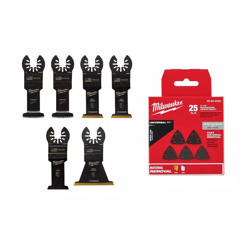 The Milwaukee Universal Fit OPEN-LOK 6-Piece Oscillating Multi-Tool General Purpose Blade Kit provides users with an assortment of blades for cutting hardwood, wood and nails, wood, PVC, and drywall. The included Titanium Enhanced Bi-Metal Blades use premium high-speed steel and last up to 15X longer than standard high carbon steel (HCS) blades. The bi-metal blade is ideal for smooth cuts in wood and nails, PVC, and drywall. The Triple Ground Japanese Tooth Blades deliver up to 2X faster cuts than the previous Milwaukee HCS blade and features a PRO-CURVE cutting edge for greater control. Ideal for fast, clean cuts in hardwood and can also be used in other woods, PVC, and drywall. The oscillating wood blade has been designed with precision ground aggressive teeth for fast cuts in wood, drywall, and PVC. This oscillating tool blade variety pack is designed with global materials and includes a storage case. The Milwaukee Universal Fit OPEN-LOK 3-1/2 in. Triangle Sandpaper 25-Piece Variety Pack is designed for Oscillating Multi-Tools. The 3-1/2 in. Triangle Sandpaper utilizes Hook and Loop technology for fast and secure paper changes. The universal hole placement allows for use with dust Extraction systems. This kit includes 60-grit, 80-grit, 120-grit, 180-grit, and 240-grit silicon carbide sandpaper ideal for paint removal and wood sanding, helping users gain access in hard to reach areas.