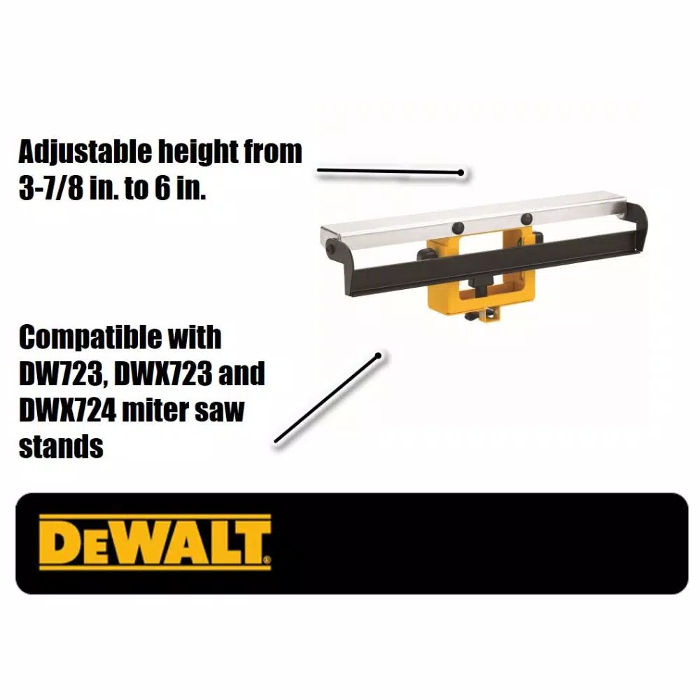 The DEWALT Wide Miter Saw Stand Material Support and Stop holds wide material in place for cutting. It also keeps your stock from falling off the front or back. The support is durable enough to withstand tough working conditions yet constructed of lightweight aluminum. It has a flip-up stop for fast conversion to a cut stop and is adjustable in height to fit your miter saw table height.